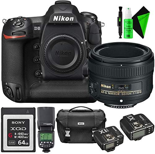 THIS GREENS CAMERA WORLD BUNDLE INCLUDES FULL USA WARRANTY and the following items: Nikon D5 DSLR Camera (Body Only, Dual XQD Slots) | NIKON 50mm 1.8G AF-S Lens | Sony 64GB QXD Memory Card | GODOX TTL Speedlite(for Nikon) | GODOX TTL Flash Trigger | USB SDHC Card Reader | Nikon Gadget Bag For DSLR Cameras | Pro Cleaning Kit | Fibercloth | Cleaning Solution | Brush | Dust Blower