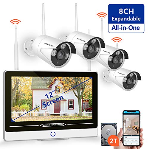 SMONET All in One with 12″ Monitor 1080P Security Camera System Wireless,8-Channel Outdoor Home Camera System(2TB Hard Drive),4pcs 2.0MP(1080P) Waterproof Wireless IP Cameras,P2P,Free APP