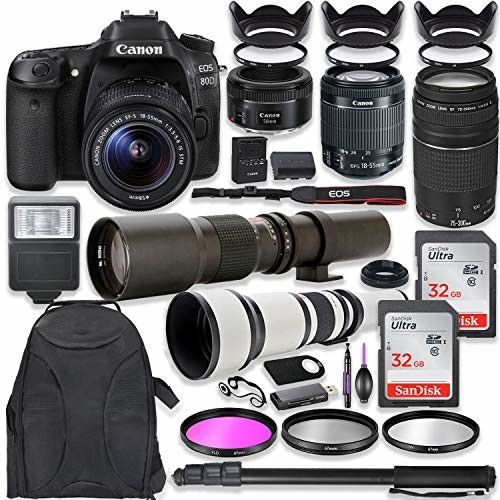 • Canon EOS 80D DSLR Camera with 18-55mm Lens Bundle EF 75-300mm III Lens, 50mm f/1.8, 500mm Lens & 650-1300mm Lens Backpack + 64GB Memory + Monopod + Professional Bundle